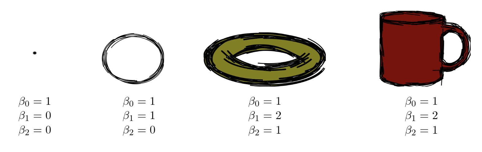 Key Takeaway: Betti Numbers serve the purpose of topologically classifying objects. A few common objects, with their Betti Numbers are given below. ( denotes the dimensional betti number.)