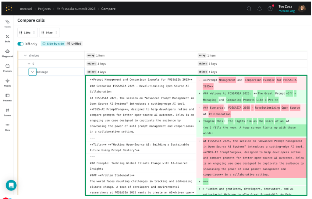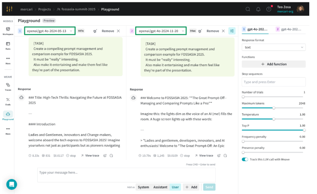 “W&B Weave gives us facilities to try prompt A vs. prompt B, against different models, and compare between those different models and see what changed,” said Teo. “Having observability in both our inputs and outputs lets us very easily narrow down what’s working best for this app in this use case.”